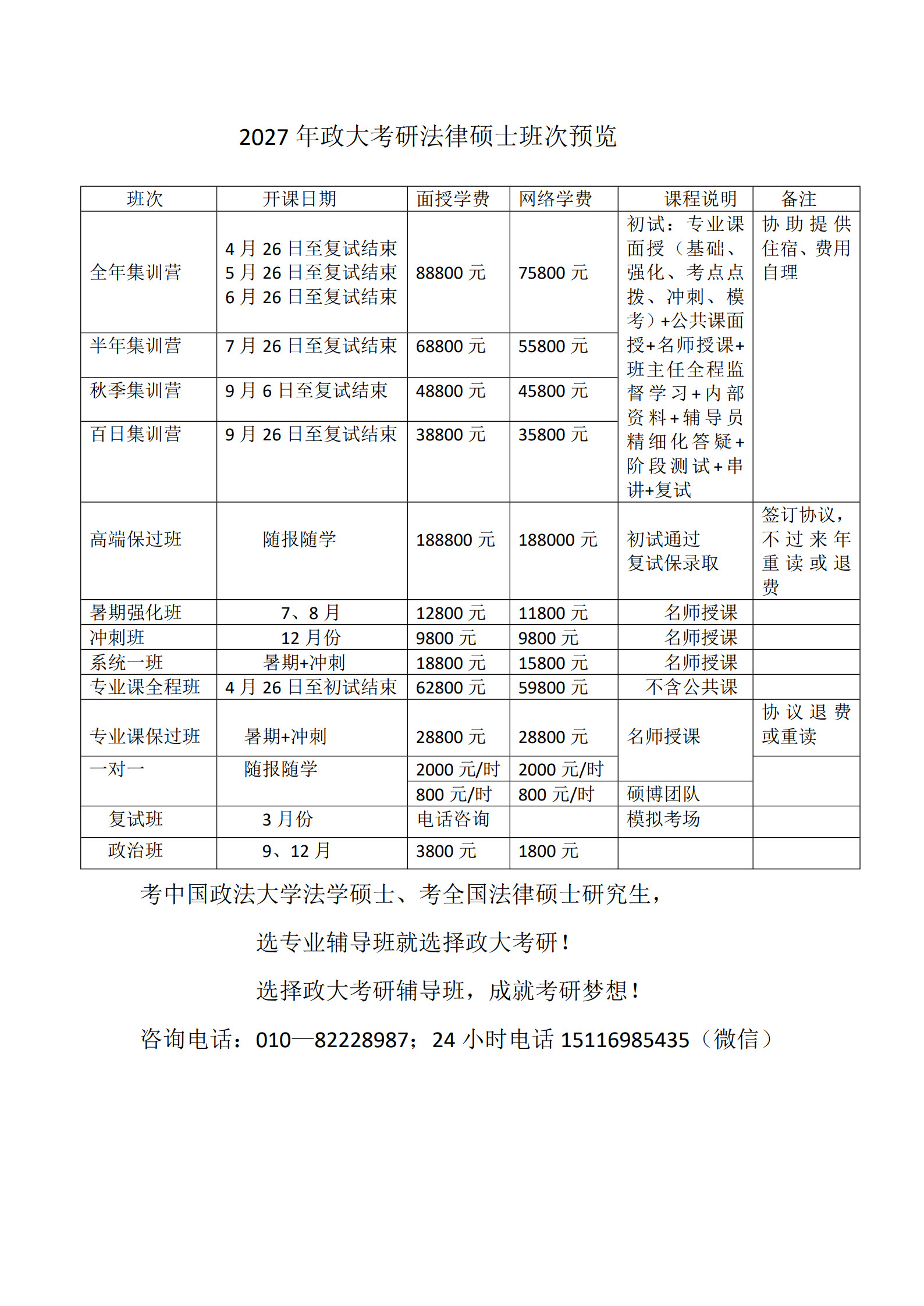 还等什么赶紧加入政大考研集训营,真正的小班教学,每班不超过20人,自己学无头绪,效率低,想一次性考上研究生的同学加入政大考研集训营,实现自己的考研梦想。机会只留给有远见的的人,抓住政大考研集训营给的机会,在这里有人管、有人监督你的学习,只要你有不怕吃苦的精神,和优秀的研究生在一起,你也会成为像他们一样优秀的人。政大考研集训营不仅开设专业课:宪法学、法理学、民事诉讼法学、民法学和刑法学,经济法、国际法、中国法制史等,还单独开设英语和政治辅导,只要是考研科目,一科不落每天保证十几个小时的高强度学习,只要你有勇气,那就来政大考研集训营。2025年7月11日,中国政法大学公布了关于调整2026年硕士研究生招生考试部分专业(方向)初试科目的通知,对法学学术学位专业课调整,变化很大,请2026年和2027年报考中国政法大学的考生多加关注。政大考研与时俱进,也将对授课内容进行调整,合理化安排授课。 咨询报名电话:010—82228987;微信同步15116985435
